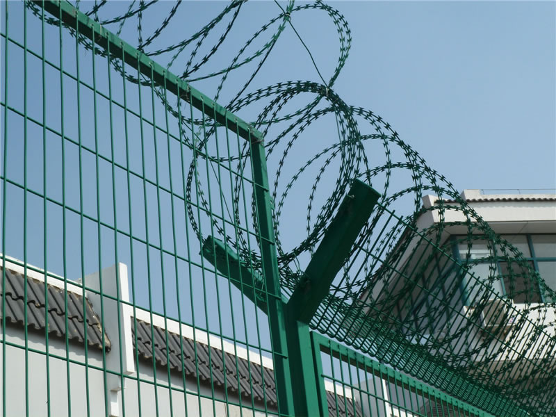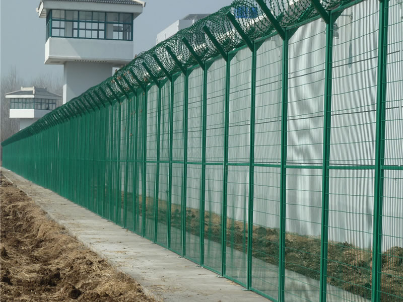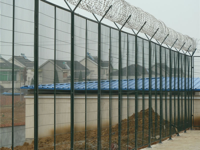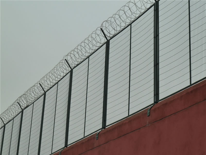 監獄護欄網現被廣泛應用在監獄,軍事基地等高安全場所。注:如果在監獄護欄網頂部加裝刀片刺絲、刀片刺繩后又很好的增強了安全防護性能。采用電鍍、熱鍍、噴塑、浸塑等防腐形式,具有很好的抗老化、抗曬、耐候等特點。其產品造型美觀、花色多樣,既起到圍欄作用,又起到美化作用。由于具有安全性高、防攀爬能力好,網片連接方式采用SBS緊扣件,有效防止人為的破壞性拆卸,橫向四道折彎加強筋,使網面強度大大增加。